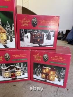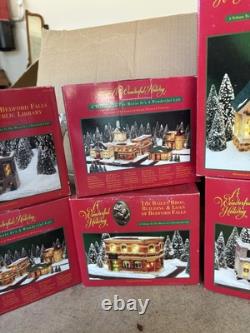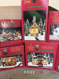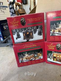 The A Wonderful Life Holiday Village 8pc Set is a festive and charming Christmas village collection from the Snow Village series, manufactured in the 1990s. Each piece is intricately detailed and painted in a multicolor palette, bringing the magic of the holiday season to any room. Packaged in a box, this set includes 8 original pieces perfect for creating a cozy and nostalgic Christmas scene. None of the pieces are damaged and they are like new. If you want the lights to work, you may have to get new bulbs if you're looking for an individual building let me know and I can create a separate listing for you.