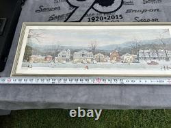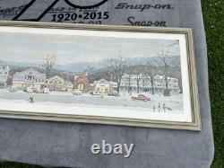 Signature is fading but still noticeable. The product is a large signed Norman Rockwell painting titled "Stockbridge Main St at Christmans (Home for Christmas)" from 1967. The multicolored Americana artwork features a rectangular shape and measures 29 inches in length and 9 inches in height. This original piece is a timeless holiday collectible depicting a classic Christmas scene by renowned artist Norman Rockwell. Perfect for any room in an adult's home, this unique piece comes unboxed and is a true representation of American culture during the festive season.